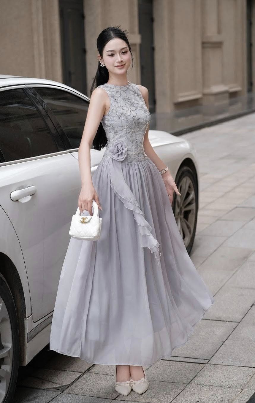 ĐẦM XÒE DÁNG DAI TRỄ VAI KÈM TAG ĐÁ