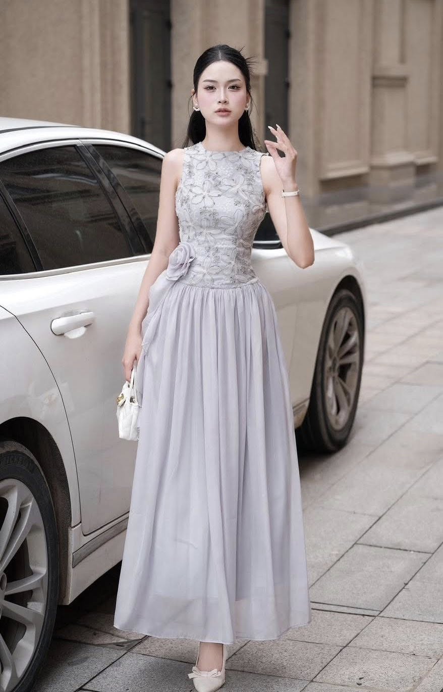 ĐẦM TAFTA KẾT HOA TRỄ VAI.