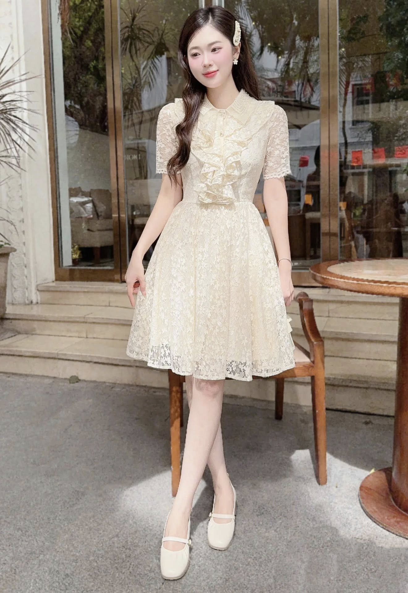 ĐẦM REN TAY NGẮN CỔ NHẪN BÈO