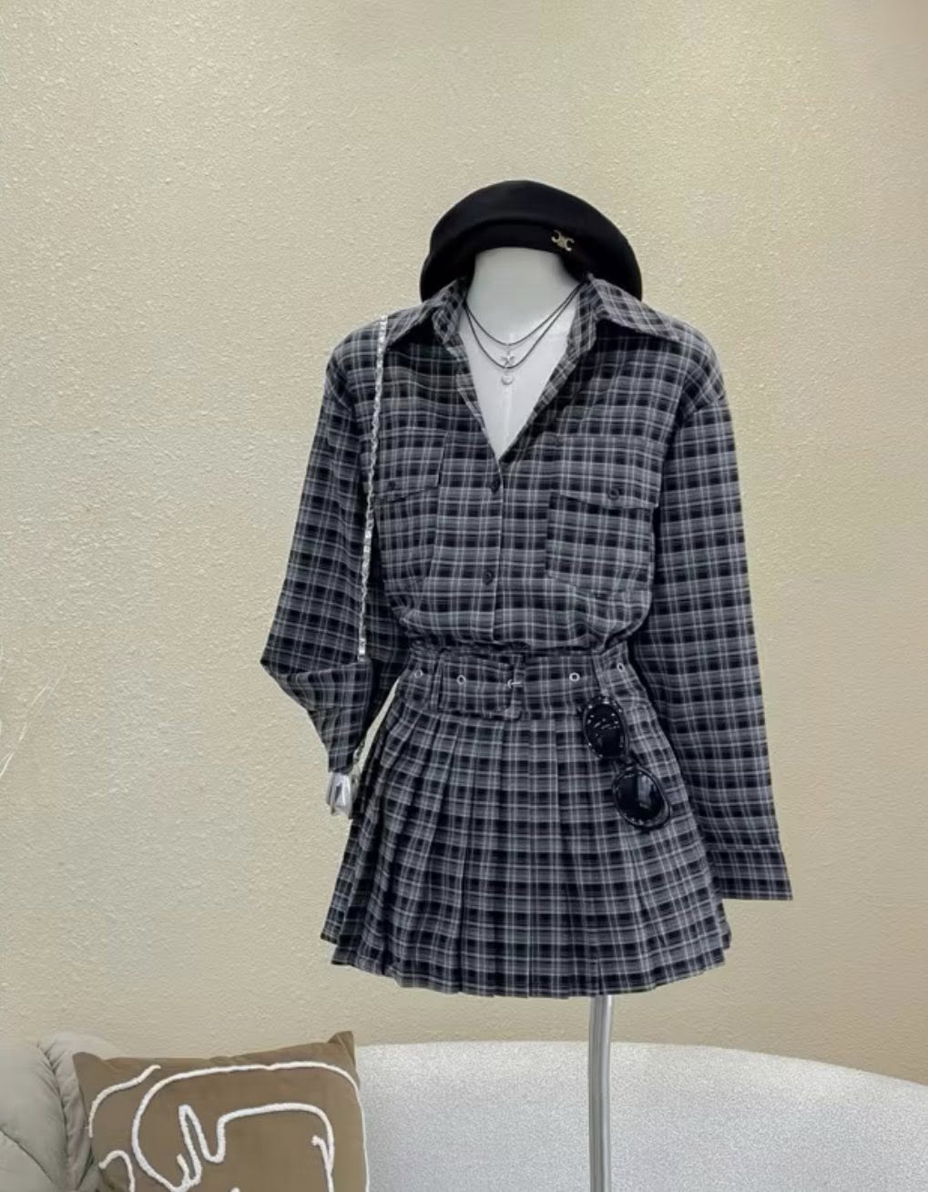 SET ÁO CARO TAY DÀI + CHÂN VÁY XẾP LY