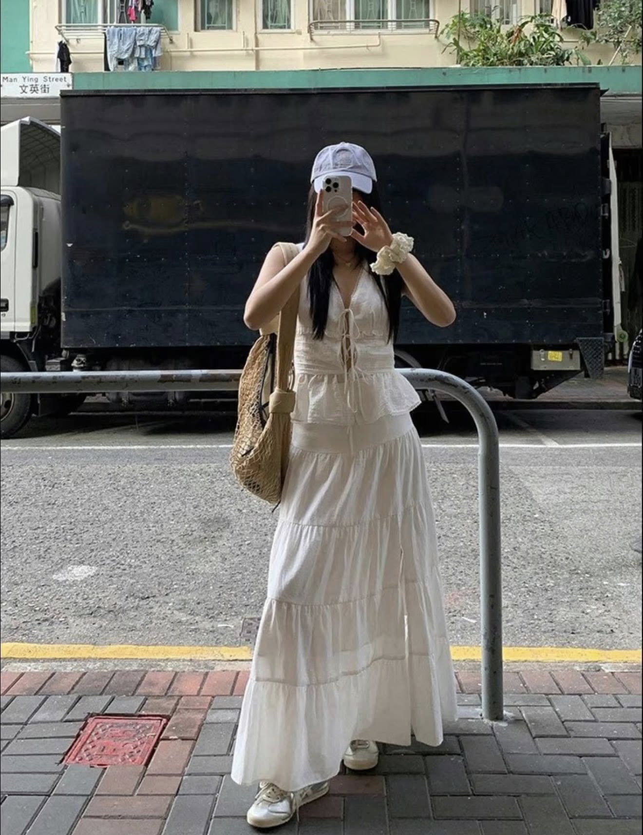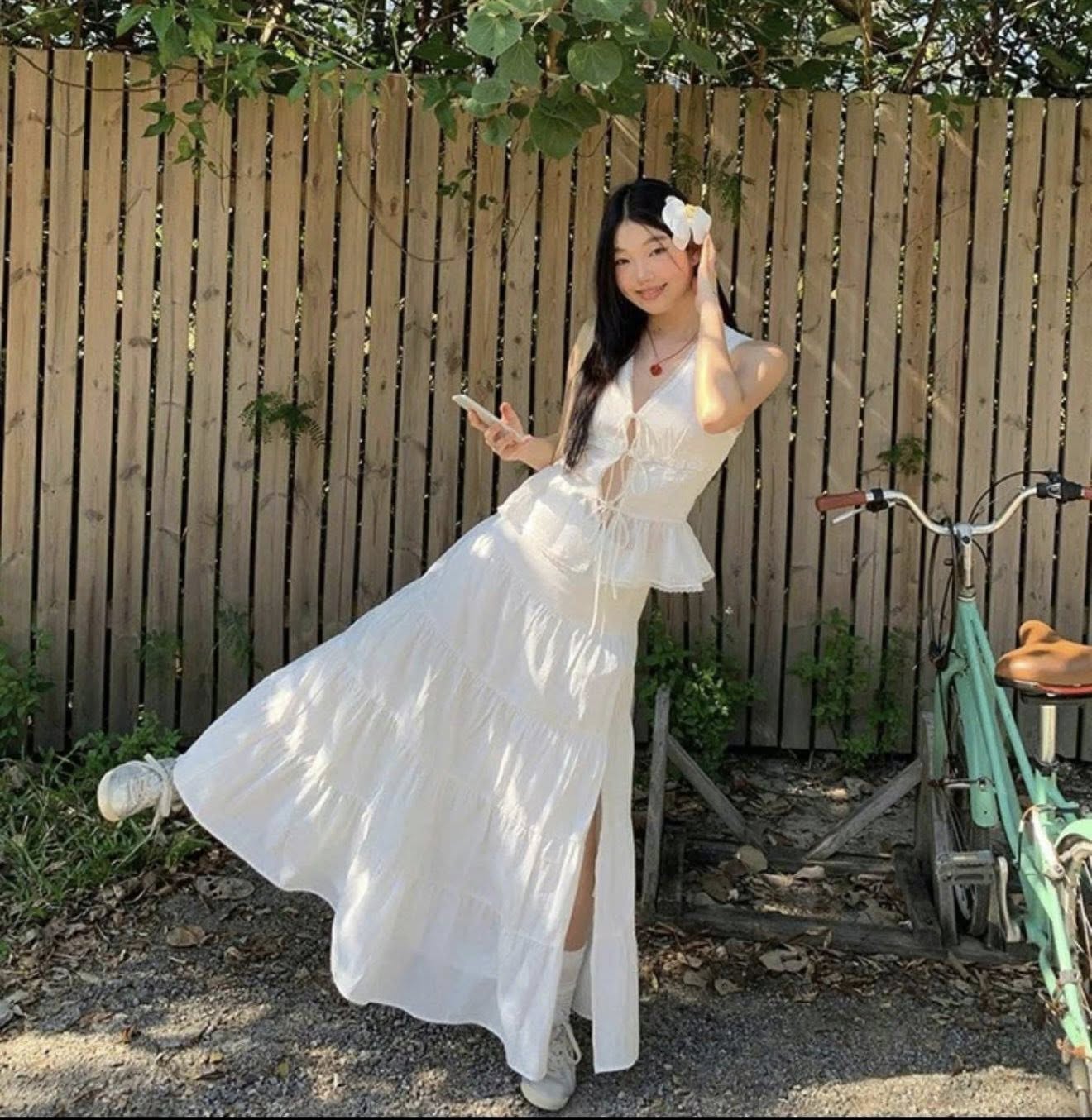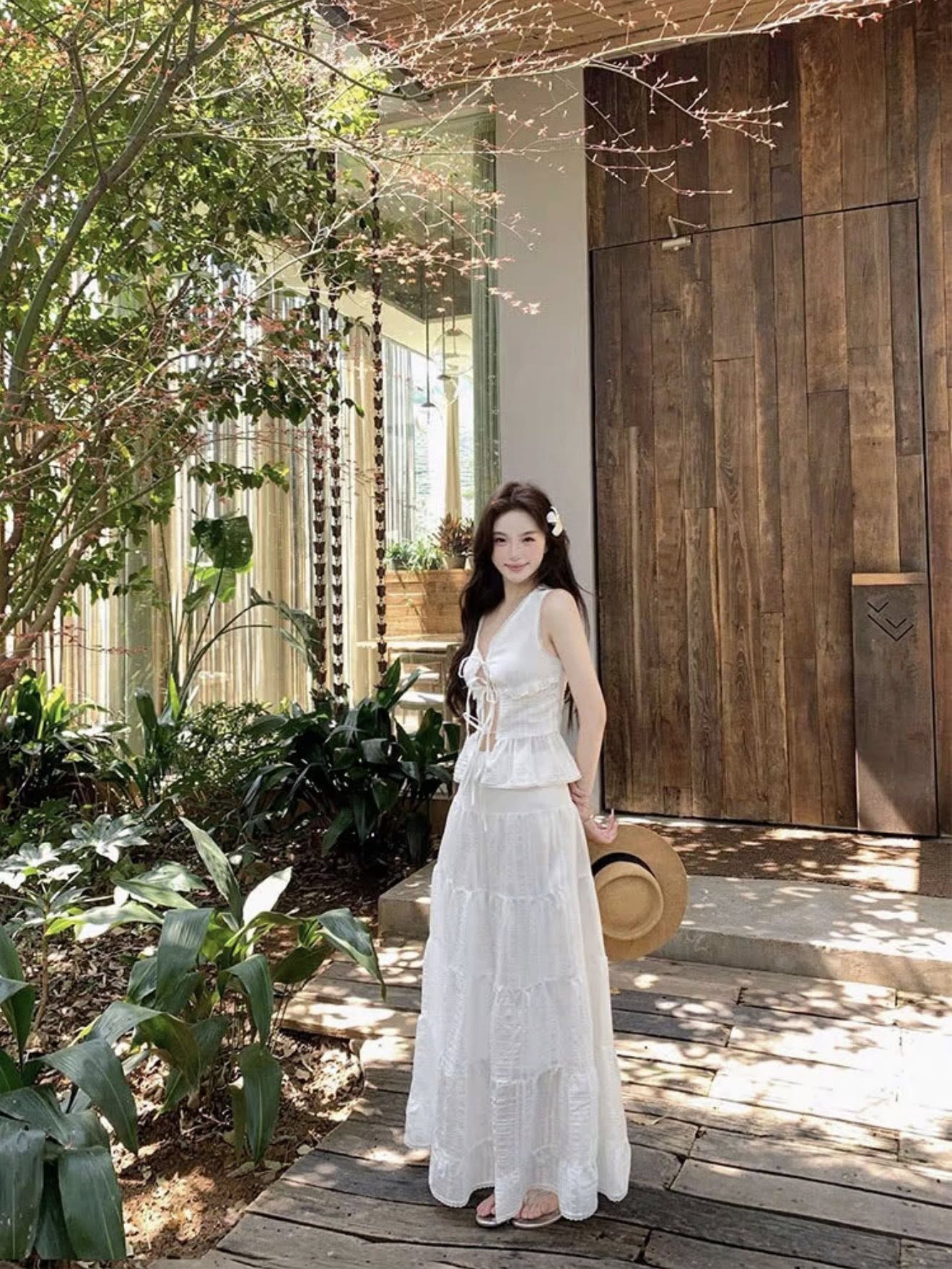 SET ÁO SÁT NÁCH CỘT DÂY + CHÂN VÁY TẦNG DÀI